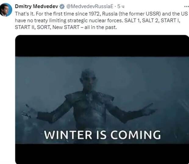 Договора, ограничивающего ядерные арсеналы России и США, больше нет, констатировал зампред Совбеза РФ Дмитрий Медведев в соцсети X. К своему комментарию российский политик добавил кадр из сериала «Игра престолов» с надписью «Winter is coming».